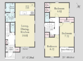 | 間取詳細 | (1F)LDK18、(2F)洋7.5、(2F)洋6.2、(2F)洋6 |
