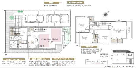 ■共通設備・仕様:24時間換気システム、1坪タイプシステムバス、浴室換気乾燥機付き、システムキッチン、シャンプードレッサー、シャワートイレ、TVモニター付きインターホン、ペアガラスサッシ、基礎パッキン工法、床下収納庫付き