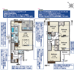 ■共通設備・仕様:24時間換気システム、1坪タイプシステムバス、浴室換気乾燥機付き、システムキッチン、食洗機付き、シャンプードレッサー、シャワートイレ、TVモニター付きインターホン、ペアガラスサッシ、基礎パッキン工法、床下収納庫付き